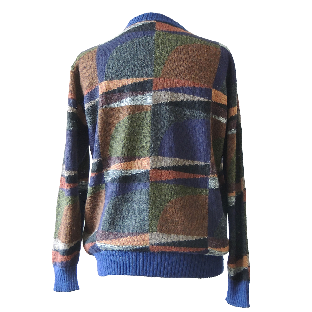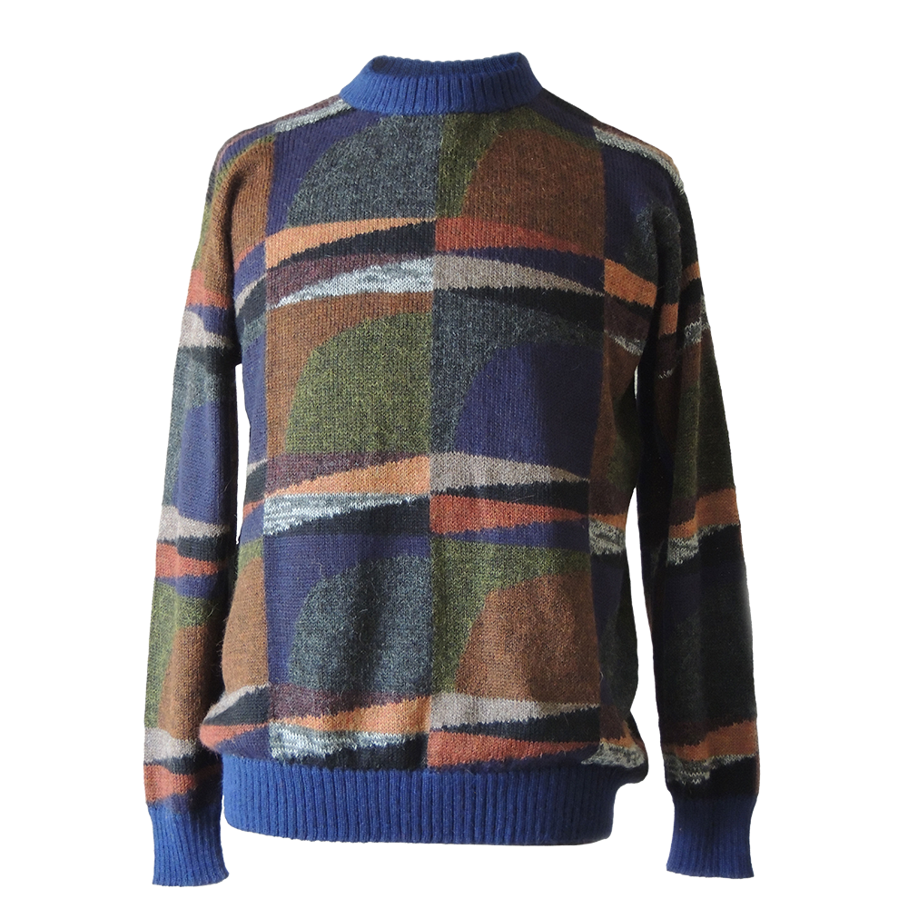 Men alpaca sweater multicolor Intarsia knitted with geometric pattern.