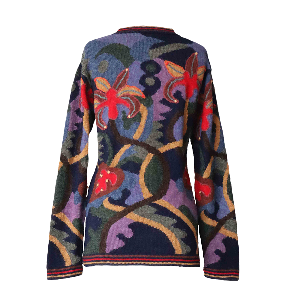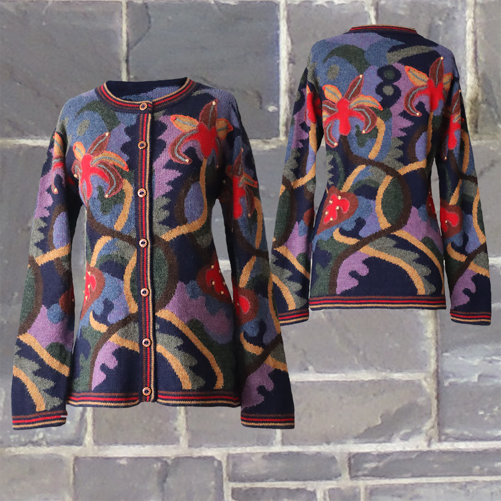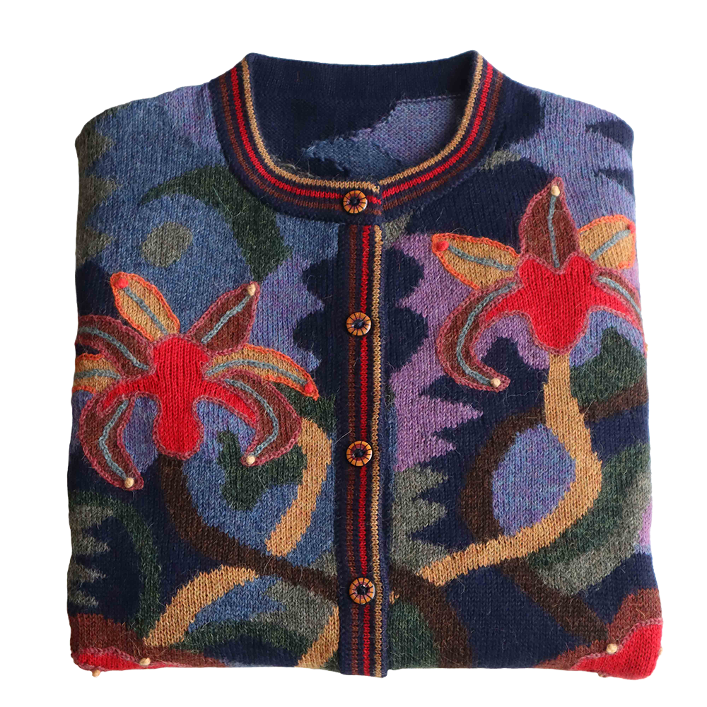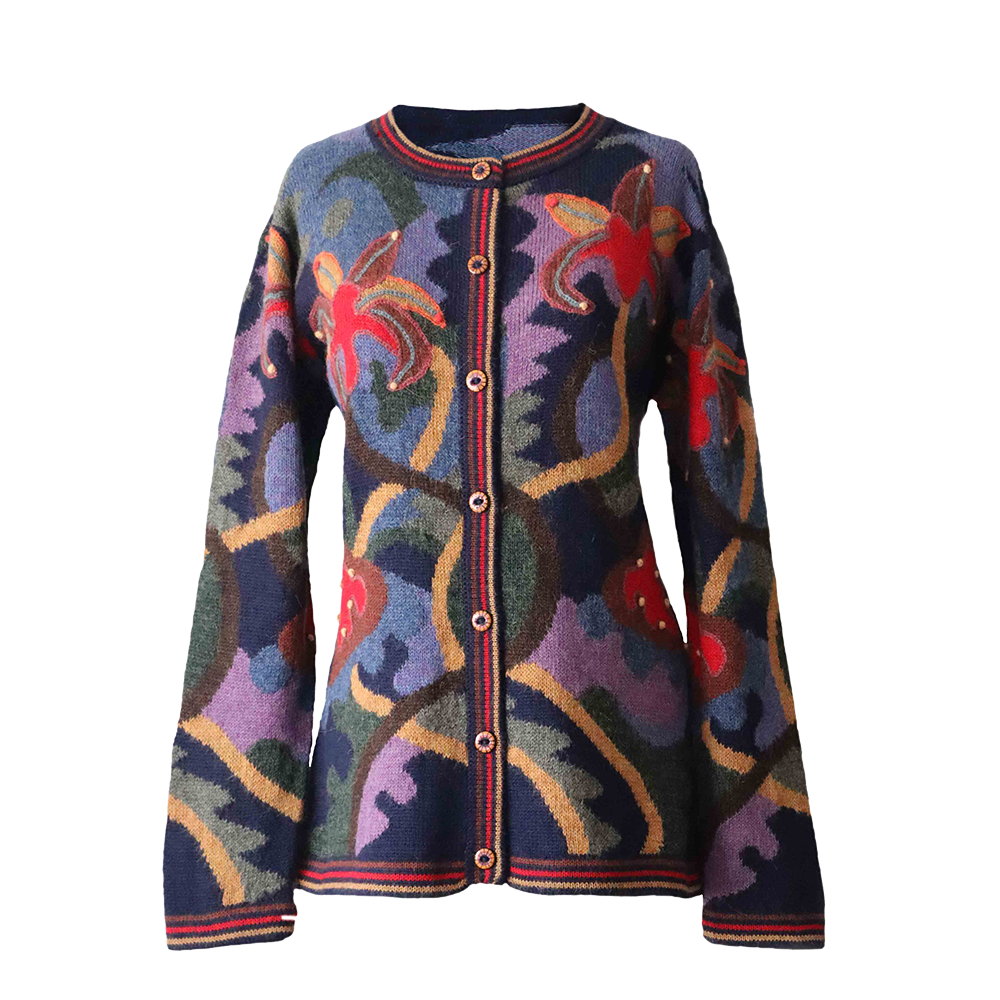 Be the first to review “Women’s alpaca cardigan Chinchero, multicolor Intarsia knitted with all over pattern.”